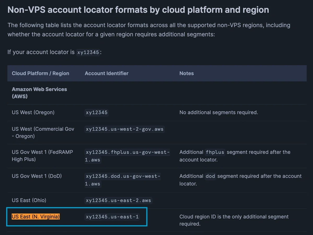 To get the Snowflake Account Identifier Open the account selector and review the list of accounts that you previously signed in to.The region in this example is US EAST (N. Virginia). Click the View account details to get the Account locator, which is XY12345 in this example. Look for the equivalent Account Identifier format from Snowflake Documentation on Account Identifiers The final Account Identifier in this example is: xy12345.us-east-1, where xy12345 is the Account locator and us-east-1 is the region code for US EAST (N. Virginia)