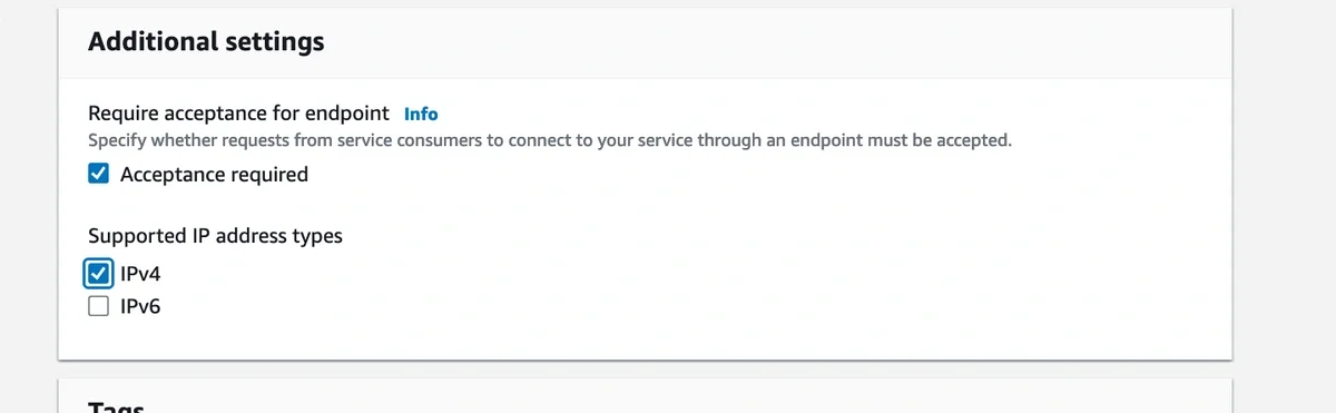 Next, create a VPC endpoint service configuration. Give it an appropriate name and select the NLB created above in the available load balancers list. Choose the other settings as specified in the image below.
