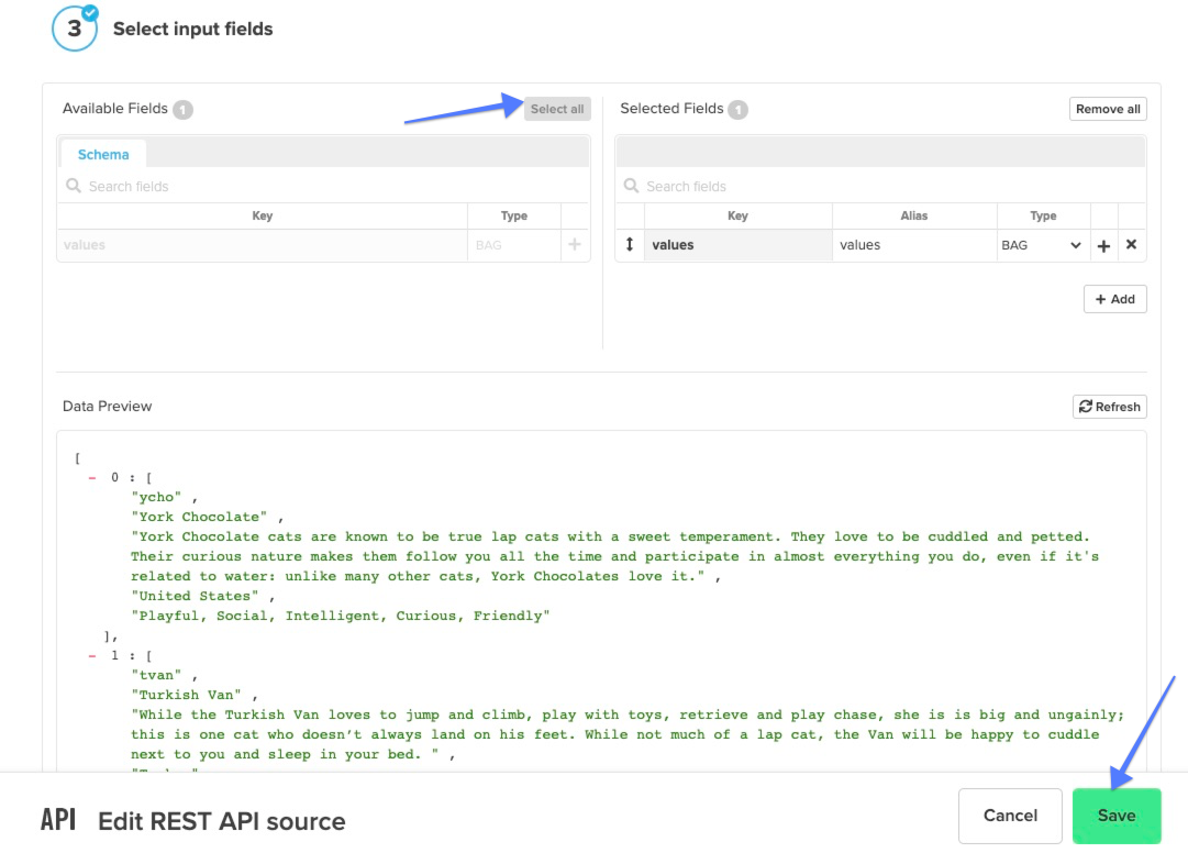 - Input fields - Click Select all to move all the Available fields over to the Selected fields or pick and choose which fields you would like by clicking on the + icon next to the field name in the Available Fields column. Then click Save.